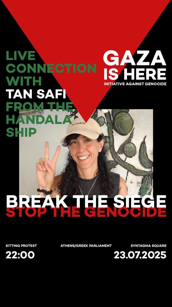Εμείς, άνθρωποι από την Παλαιστίνη, ντόπιοι και από όλο τον κόσμο, οργανώσαμε αυτή τη διαμαρτυρία μπροστά από το ελληνικό κοινοβούλιο ως μια ειρηνική αλλά επείγουσα πράξη αντίστασης. Στεκόμαστε ενάντια στη συνεχή γενοκτονία που εκτυλίσσεται στη Γάζα και στην πολιτική υποκρισία που την επιτρέπει. Εδώ και 32 συνεχόμενες ημέρες διαδηλώνουμε εδώ με σαφή αιτήματα να σταματήσει η δυστυχία του λαού μας στη Γάζα και, να σταματήσει η συνενοχή του ελληνικού κράτους και να ξεκινήσουν οι διώξεις κατά των Σιωνιστών εγκληματιών πολέμου που εισέρχονται στο ελληνικό έδαφος. Οι ακτιβιστές του Συνασπισμού του Στόλου της Ελευθερίας που επιβαίνουν στο πλοίο «Handala» πλέουν για να σπάσουν τον διαρκή σιωνιστικό αποκλεισμό της Γάζας. Αντιμετωπίζουν εκφοβισμό από ένα κράτος που έχει παραβιάσει το διεθνές δίκαιο με κάθε δυνατό τρόπο με απόλυτη ατιμωρησία, από τη γενοκτονία των Παλαιστινίων μέχρι την παράνομη ενέδρα και την απαγωγή των 12 ακτιβιστών που επέβαιναν στο «Madleen» μόλις τον περασμένο μήνα. Η κατάσταση σε όλη την Παλαιστίνη είναι τραγική. Μέχρι σήμερα, περισσότεροι από 60.000 Παλαιστίνιοι έχουν σκοτωθεί στη Γάζα. Οι βομβαρδισμοί των γειτονιών είναι αμείλικτοι και η πείνα εξαπλώνεται στη Γάζα καθώς η Σιωνιστική οντότητα συνεχίζει να αποκλείει την είσοδο τροφίμων, νερού και φαρμάκων. Εν τω μεταξύ, ο σιωνιστικός κατοχικός στρατός σφαγιάζει βάρβαρα τους Παλαιστίνιους στους χρηματοδοτούμενους από τις ΗΠΑ χώρους διανομής «ανθρωπιστικού» ιδρύματος στη Γάζα. Πάνω από 800 άνθρωποι έχουν δολοφονηθεί προσπαθώντας να εξασφαλίσουν τρόφιμα για τις οικογένειές τους από τον Μάιο. Το «Handala» μεταφέρει επισιτιστική βοήθεια και κρίσιμες ιατρικές προμήθειες στη Γάζα, με πρόθεση να δημιουργήσει έναν ανθρωπιστικό διάδρομο. Η ελληνική κυβέρνηση συμμετέχει ενεργά στη γενοκτονία: σιωνιστικά πλοία ανεφοδιάζονται στο λιμάνι του Πειραιά. Οι ελληνικές αγορές είναι γεμάτες από σιωνιστικά προϊόντα. Το ελληνικό έδαφος φιλοξενεί στρατιωτικές βάσεις του μεγαλύτερου αρωγού της Σιωνιστικής Οντότητας, των Ηνωμένων Πολιτειών. Ο ελληνικός στρατός συνεργάζεται με τις σιωνιστικές δυνάμεις κατοχής, πραγματοποιώντας κοινές ασκήσεις και ανταλλάσσοντας όπλα αξίας δισεκατομμυρίων ευρώ. Η ελληνική κυβέρνηση και η Σιωνιστική Οντότητα έχουν υπογράψει συμφωνία κοινής αγοράς για την κατασκευή του δικού της «Σιδηρού Θόλου» της Ελλάδας στα θαλάσσια σύνορα με την Τουρκία, με κόστος 2 δισεκατομμύρια ευρώ. Η ελληνική κυβέρνηση εξακολουθεί να επενδύει βαθιά στα σιωνιστικά ακίνητα και στον τουρισμό. Η ελληνική αστυνομία χρησιμοποιεί σιωνιστική τεχνολογία για να παρακολουθεί και να καταστέλλει τα κινήματα και τον λαό μας. Ο προσφυγικός καταυλισμός της Σάμου χρησιμοποιεί συστήματα ασφαλείας που έχουν αγοραστεί από τη σιωνιστική οντότητα. Η ελληνική ακτοφυλακή χρησιμοποιεί μη επανδρωμένα αεροσκάφη «Heron» στον πόλεμο κατά των μεταναστών, εμποδίζοντας τις προσφυγικές λέμβους να εισέλθουν στα ελληνικά ύδατα, ακόμη και όταν τα σιωνιστικά πλοία περνούν ελεύθερα. Είμαστε εδώ σε αλληλεγγύη με τη Γάζα και σε αλληλεγγύη με τις προσπάθειες του Συνασπισμού του Στόλου της Ελευθερίας να σπάσει την πολιορκία. Η πρωτοβουλία «Gaza is Here» συνεχίζει έτσι τη συνεργασία της με την FFC. Ο Thiago Avila μοιράστηκε μαζί μας την εμπειρία του στο «Madleen» νωρίτερα αυτό το μήνα. Επεκτείνουμε επίσης την υποστήριξή μας σε άλ