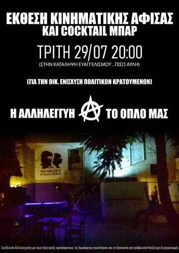 Τη Τρίτη 29/07 θα πραγματοποιηθεί έκθεση κινηματικής αφίσας & κοκτέιλ μπαρ από τις 20:00 στην αυλή της κατάληψης Ευαγγελισμού.