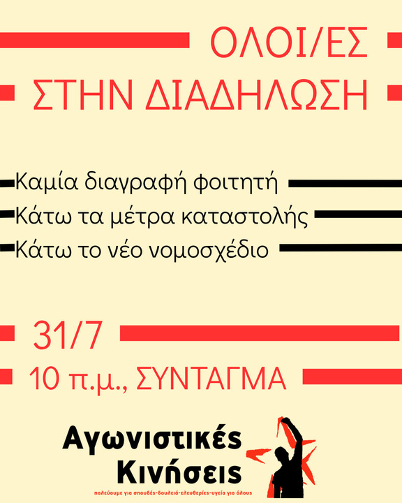 ΑΓΩΝΙΣΤΙΚΕΣ ΚΙΝΗΣΕΙΣ | Ολοι/ες στη διαδήλωση 31/7, 10πμ στο Σύνταγμα - Καμμια διαγραφή φοιτητή Κάτω τα νέα μέτρα ασφαλείας Κάτω το νέο νομοσχέδιο