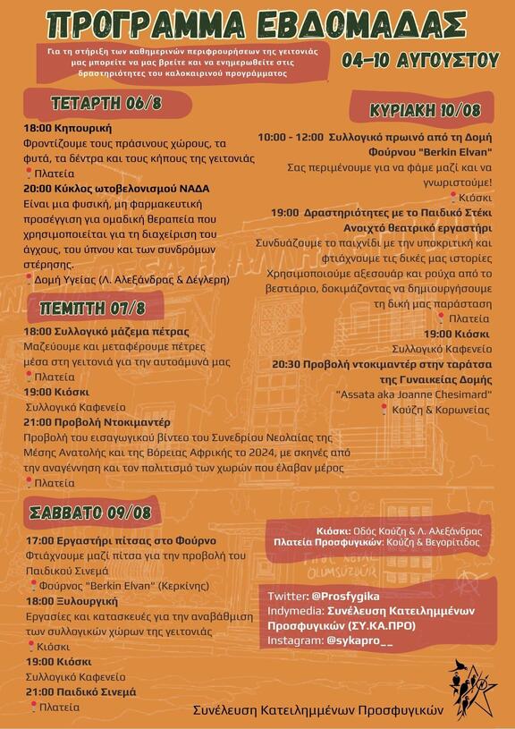 Το καλοκαιρινό πρόγραμμα Αυγούστου της Κοινότητας Κατειλημμένων Προσφυγικών μπορεί να βρεθεί εδώ: https://athens.indymedia.org/post/1637279/