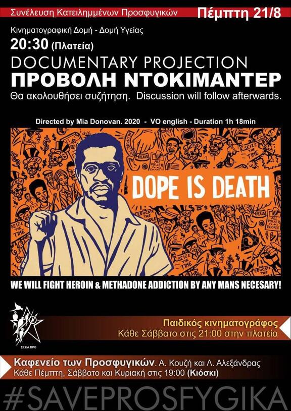 At Thursday 21/8 at 20.30 at the Square of Prosfygika (Kouzi & Vegoritidos) the documentary "Dope is Death" will be screened by the Health Structure of Prosfygika and an open discussion wil follow.