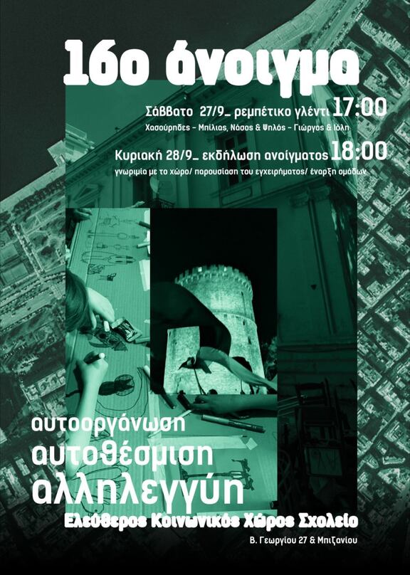 Έτσι λοιπόν, σας καλούμε όλους, -ες, -α στο άνοιγμα του 16ου έτους λειτουργίας του Ελεύθερου Κοινωνικού Χώρου Σχολείο, όπου θα πραγματοποιηθεί αυτοπαρουσίαση του εγχειρήματος, των πολιτικών και κοινωνικών προεκτάσεών του μέσα από μία σειρά ιστοριών. Θα συζητήσουμε όλοι και όλες μαζί σχετικά με τη λειτουργία του χώρου και των δραστηριοτήτων, θα προτείνουμε και θα οργανώσουμε τη δημιουργία/συνέχιση των ελεύθερων μαθημάτων, θα ζυμωθούμε και θα σχεδιάσουμε τη νέα «σχολική χρονιά».