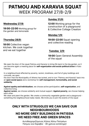Ανοίγουμε την πόρτα της κατάληψης και δίνουμε ζωή στον κήπο των 2,1 στρεμμάτων της Πάτμου και Καραβία, για να γίνει ξανά ένα σημείο συνάντησης, αυτοοργάνωσης και κοινωνικοπολιτικής δράσης στα Κάτω Πατήσια.