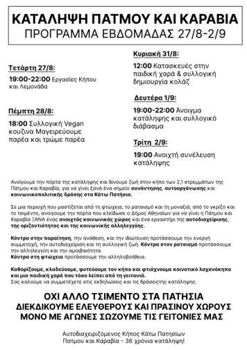 Ανοίγουμε την πόρτα της κατάληψης και δίνουμε ζωή στον κήπο των 2,1 στρεμμάτων της Πάτμου και Καραβία, για να γίνει ξανά ένα σημείο συνάντησης, αυτοοργάνωσης και κοινωνικοπολιτικής δράσης στα Κάτω Πατήσια.