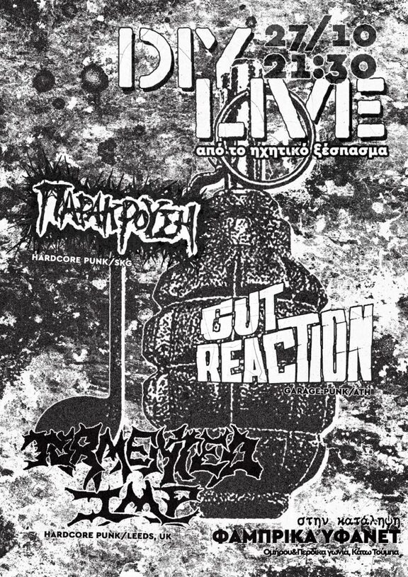 Δευτέρα 27/10, στις 21:30, στην κατάληψη Φάμπρικα Υφανέτ, η punk συναυλιακή ομάδα Ηχητικό Ξέσπασμα διοργανώνει D.I.Y. live με: