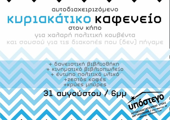 To Υπόστεγο ανοίγει με Αυτοδιαχειριζόμενο Κυριακάτικο Καφενείο στον κήπο για χαλαρή πολιτική κουβέντα και ακόμα πιο χαλαρό σουσού για τις διακοπές που (δεν) πήγαμε μετά συνοδείας, μουσικής, -ζεστού- καφέ και κρύων μπυρών και άλλων ροφημάτων.