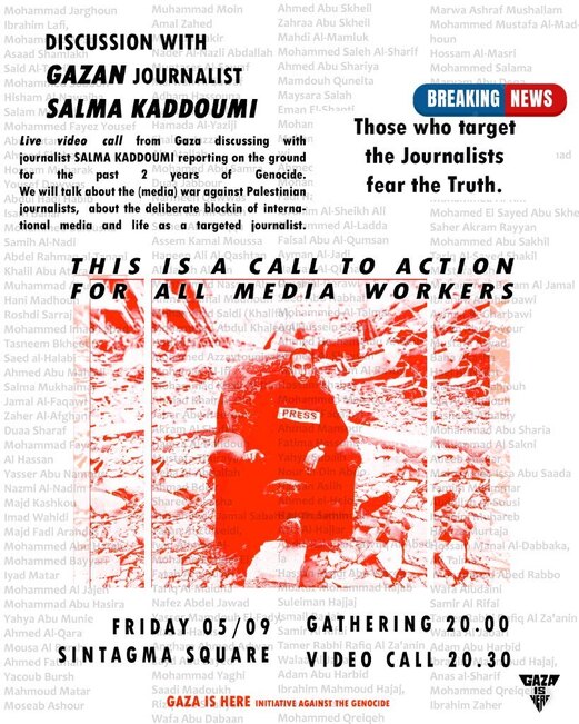 Την Παρασκευή 5/6, στις 20:00 συναντιόμαστε στη πλατεία Συντάγματος για να συνδεθούμε απευθείας με την πόλη της Γάζας και την δημοσιογράφο Salma Kaddoumi, οπού τα τελευταία σχεδόν 2 χρόνια, καλείται να καλύψει την γενοκτονία του ίδιου της του λαού. Συζητάμε για τη στάση των διεθνών media, τις πολιτικές προπαγάνδας της σιωνιστικής οντότητας, καθώς και την συστηματική και καλοσχεδιασμένη στοχοποίηση των ανθρώπων των media από το Ισραήλ.