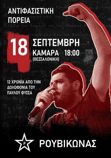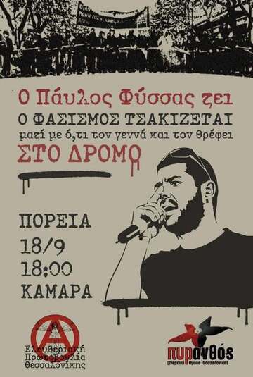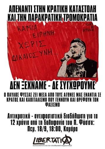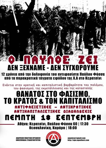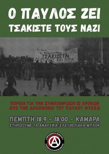 Κάλεσμα στην αντιφασιστική/αντικρατική πορεία με αφορμή την συμπλήρωση 12 χρόνων από την δολοφονία του αντιφασίστα ράπερ Παύλου Φύσσα