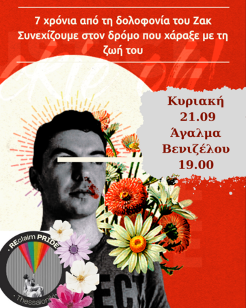 Επτά χρόνια μετά την άγρια δολοφονία, τα περιστατικά βίας πληθαίνουν εις βάρος μας -βία κρατική και μη εναντίον κάθε διαφορετικής ταυτότητας, κάθε έκφρασης και κάθε φωνής που δεν εντάσσεται στα πατριαρχικά, ετεροκανονικά πρότυπα. Η κατάσταση αυτή διαμορφώνει μια νοοτροπία πειθήνιας, άβουλης και -ακόμη καλύτερα- παθητικά μη αντιδραστικής κοινωνίας. Η ευθύνη για την άμβλυνση αυτής της κατάστασης πέφτει σε όλα μας. Η ευθύνη να αποσιωπήσουμε τις μακιαβελικές (ο σκοπός αγιάζει τα μεσα) πολιτικές του νεοφιλελευθερισμού για την εγκαθίδρυση της κοινωνικής συνοχής. Με τον αγώνα και την ύπαρξη μας προκαλούμε την κυριαρχία του συστήματος! Δε θα αφήσουμε ποτέ την φωνή της Zackie να χαθεί!