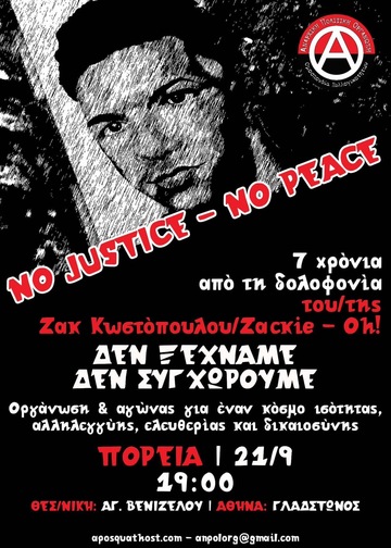 Δεν ξεχνάμε, ούτε συγχωρούμε λοιπόν. Διατηρούμε στη συλλογική μας μνήμη τον Ζακ/τη Zackie, καθώς και όλα τα θύματα του κρατικού-καπιταλιστικού-πατριαρχικού συστήματος και συνεχίζουμε να αγωνιζόμαστε για μια πιο ελεύθερη και αξιοπρεπή ζωή. Ξέρουμε ότι η δικαιοσύνη για τους ανθρώπους της τάξης μας δεν θα έρθει από ένα σύστημα που δολοφονεί και ύστερα συγκαλύπτει τα "παιδιά" του· η μόνη αληθινή δικαιοσύνη μπορεί να έρθει από την καταστροφή αυτού του κόσμου της βίας και της εκμετάλλευσης. Έτσι απέναντι στις πολιτικές του κράτους που περιθωριοποιούν και εξοντώνουν, απέναντι στους στρατούς καταστολής του και τους φασίστες, απέναντι σε κάθε μορφή εξουσίας, προτάσσουμε την οργάνωση και τους κοινούς αγώνες των καταπιεσμένων ενάντια στους καταπιεστές τους. Χτίζουμε κοινότητες με βάση την ελευθερία και την ισότητα· υφαίνουμε δεσμούς αυτοοργάνωσης και αλληλεγγύης.