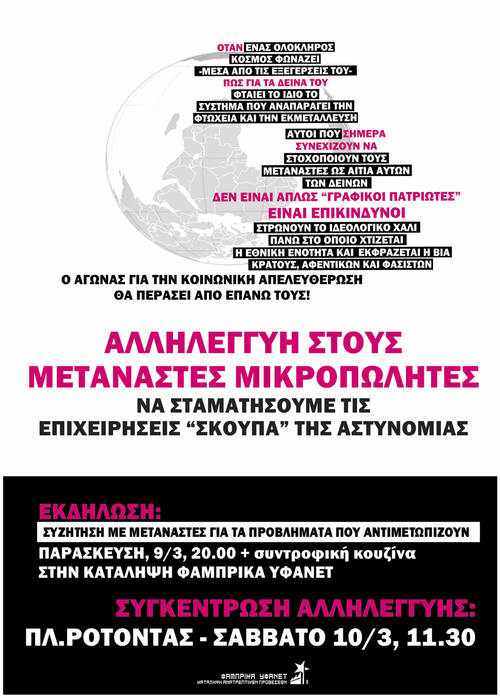 Σ' αυτήν, λοιπόν, την περίοδο που διανύουμε, είναι πιο επιτακτικό όσο ποτέ να εντείνουμε την επίθεση σε αυτό το ιδεολογικό στρώμα ρατσισμού που πάει να αναπτυχθεί. Ξέρουμε ότι η δική μας "έξοδος από την κρίση" δεν είναι αυτή που θέλει εκμεταλλευτές και εκμεταλλευόμενους, όλους μαζί, να κάνουν θυσίες για το καλό του έθνους. Αν βλέπουμε κάπου αυτήν την "έξοδο", αυτή βρίσκεται στους κοινούς αγώνες ντόπιων-μεταναστών που αναπτύσσονται, στις συναντήσεις ανθρώπων που αγωνίζονται για τις καθημερινές τους ανάγκες, στους αγώνες του αύριο που έρχονται. Κομμάτι όλων αυτών είναι και η έμπρακτη εναντίωση στα καθημερινά πογκρόμ των μεταναστών μικροπωλητών. Να σπάσουμε τη σιωπή που υπάρχει μέχρι σήμερα, να μην αφήσουμε τις πλατείες να γίνουν σκηνικά για ανθρωποκυνηγητά, ξυλοδαρμούς και συλλήψεις. Ενάντια σε μία φιλανθρωπική οπτική που αντιμετωπίζει τους μετανάστες ως θύματα, να δημιουργήσουμε κοινότητες αγώνα ενάντια στην υποτίμηση όλων μας, χωρίς να παραβλέπουμε τις διαφορετικές αφετηρίες και βιώματα του καθενός μας. Τα σημεία συνάντησης μας θα είναι αυτά στα οποία στην πράξη θα καταργηθούν οι ρατσιστικές πολιτικές. Σημεία όπως η απεργία πείνας των 300 μεταναστών εργατών του 2011, ο αγώνας των Αιγύπτιων αλιεργατών στη Μηχανιώνα το 2010, η δυναμική απάντηση στη δολοφονία του Τόνυ Όνουα το 2007. Σημεία όπου, μαζί, οικοδομούμε έναν κόσμο αλληλεγγύης και αξιοπρέπειας.