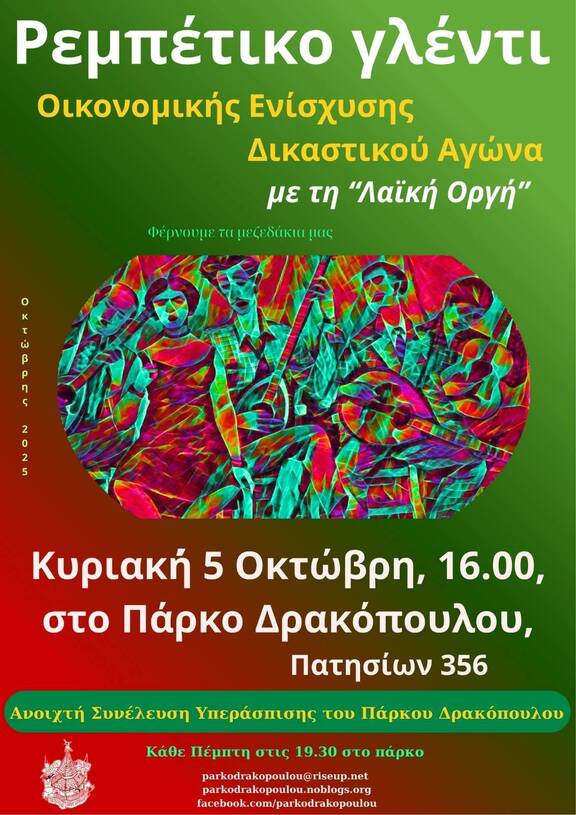ΡΕΜΠΕΤΙΚΟ ΓΛΕΝΤΙ ΟΙΚΟΝΟΜΙΚΗΣ ΕΝΙΣΧΥΣΗΣ ΔΙΚΑΣΤΙΚΟΥ ΑΓΩΝΑ ΚΥΡΙΑΚΗ 5 ΟΚΤΩΒΡΗ, 16.00, ΣΤΟ ΠΑΡΚΟ ΔΡΑΚΟΠΟΥΛΟΥ ΜΕ ΤΗ "ΛΑΪΚΗ ΟΡΓΗ"