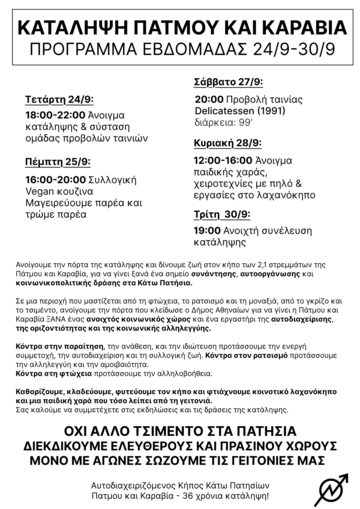 Κατάληψη Πάτμου & Καραβία Ευγενίου Καραβία 23, Κάτω Πατήσια (5' από ΗΣΑΠ Κάτω Πατήσια, Τρόλεϊ 3,5,11,14 & λεωφορεία Α8,608: στάση ΑΓΙΟΣ ΛΟΥΚΑΣ)