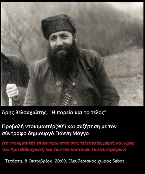Προβολή ντοκιμαντέρ (90') και συζήτηση με τον δημιουργό και σύντροφο Γιάννη Μάγγο. Το ντοκιμαντέρ είναι επικεντρωμένο στις τελευταίες ώρες και μέρες του Άρη Βελουχιώτη και των κοντινών του συντρόφων. Βασίζεται σε πρωτογενείς μαρτυρίες, εμπεριέχει φωτογραφίες και σχεδιαγράμματα. Θα ακολουθήσει συζήτηση πάνω στο ντοκιμαντέρ