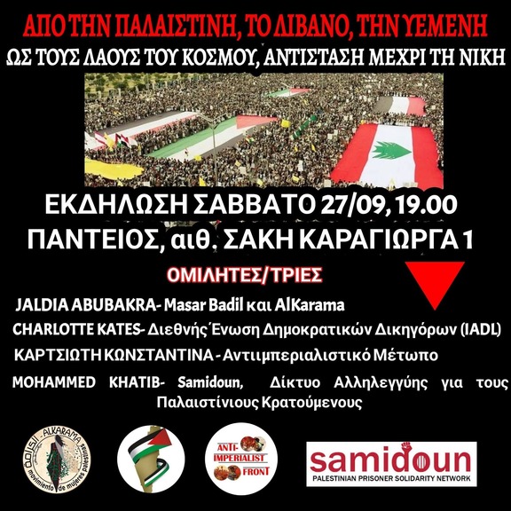 Εκδήλωση στις 27 Σεπτεμβρίου 2025 στην Αθήνα, για την πρώτη επέτειο της δολοφονίας του ηγέτη της Αντίστασης του Λιβάνου και της Χεζμπολάχ Χασάν Νασράλα, που δολοφονήθηκε με πάνω από 80 τόνους εκρηκτικών σε μια σιωνιστική/Αμερικανική επίθεση στο Λίβανο πριν από ένα χρόνο, καθώς επίσης και 25 χρόνια από την έναρξη της Αλ-Άκσα/δεύτερης Ιντιφάντα στην Παλαιστίνη στις 28 Σεπτεμβρίου 2000 και την οργάνωση του αγώνα σήμερα για τον τερματισμό της Σιωνιστικής γενοκτονίας και κατοχής στην Παλαιστίνη, για λευτεριά της από το ποτάμι στη θάλασσα και τη λευτεριά ολόκληρης της περιοχής από τη θανατηφόρα αρπαγή του ιμπεριαλισμού.