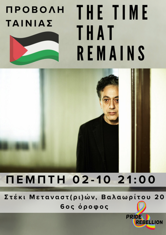 Παράλληλα θα προβάλλουμε την ταινία "The Time That Remains", μια ημι-αυτοβιογραφική κωμωδία που πραγματεύεται τη σουρεαλιστική καθημερινότητα και τη διαχρονική επιβίωση των Παλαιστίνιων υπό την Ισραηλινή κατοχή.