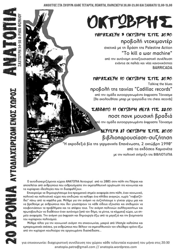 πρόγραμμα εκδηλώσεων Οκτώβρη στον αυτοδιαχειριζόμενο χώρο ΑΝΑΤόΠΙΑ