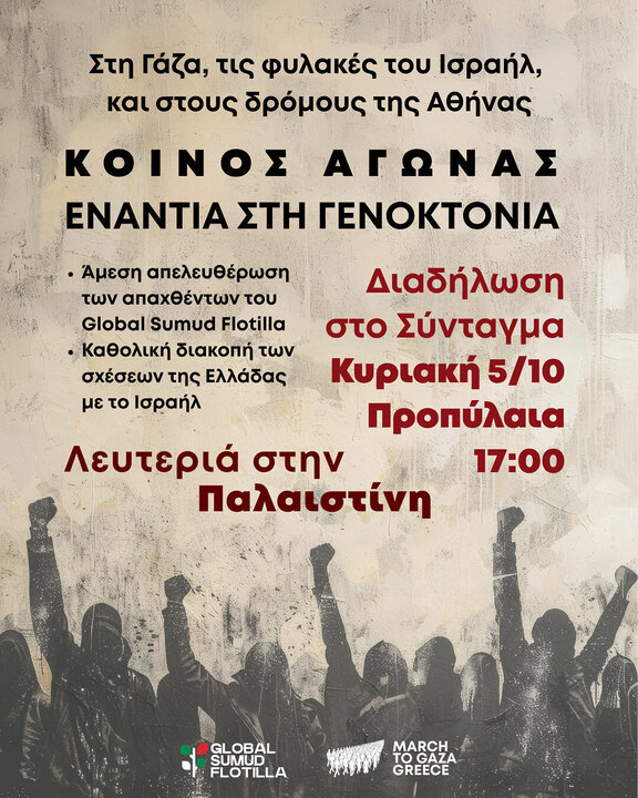 ‼️Τα μέλη της αποστολής Global Sumud Flotilla, βρίσκονται ακόμη στις φυλακές του Ισραήλ έπειτα από την παράνομη απαγωγή τους σε διεθνή χωρικά ύδατα, υπό εξαντλητικές και ασφυκτικές πιέσεις αλλά με υψηλό ηθικό και αποφασιστικότητα. Ανάμεσά τους και τα 27 μέλη της ελληνικής αποστολής, 11 εκ των οποίων έχουν ξεκινήσει απεργία πείνας.