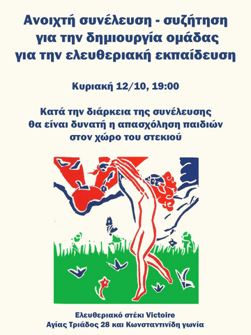Δεύτερη ανοιχτή συνέλευση - συζήτηση για τη δημιουργία ομάδας για την Ελευθεριακή Εκπαίδευση - Κυριακή 12/10 στις 19:00 στο Ελευθεριακό Στέκι Victoire