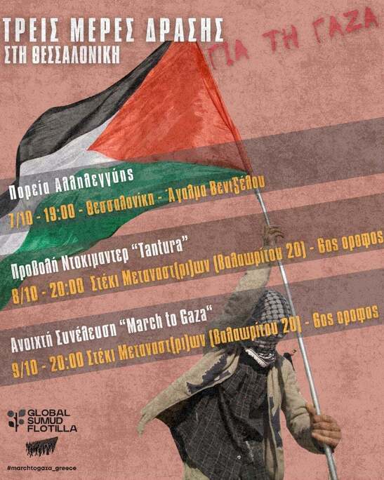 Το March to Gaza Greece, διοργανώνει στη Θεσσαλονίκη τριήμερο δράσεων, θέλοντας να υποστηρίξει τον αγώνα του Παλαιστινιακού λαού και να συσπειρώσει όλες αυτές τις δυνάμεις που διεκδικούν τον τερματισμό του πόλεμου στη Γάζα και την δημιουργία ανεξάρτητου Παλαιστινιακού κράτους.