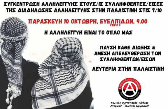 📢Όλοι/ες/α στη συγκέντρωση αλληλεγγύης στους/ις συλληφθέντες/είσσες τρομοκρατική επίθεση της αστυνομίας στη διαδήλωση για την Παλαιστίνη την Τρίτη 7/10, μεταξύ των οποίων και 3 μέλη της οργάνωσής μας, μέλη ΔΣ πρωτοβάθμιων εργατικών Σωματείων και Φοιτητικών Συλλόγων.