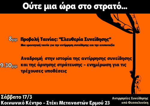 21:30 Αναδρομή στην ιστορία της αντίρρησης συνείδησης και της άρνησης στράτευσης - ενημέρωση για τις τρέχουσες υποθέσεις.