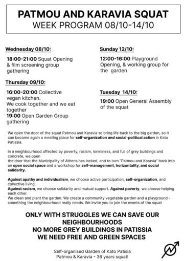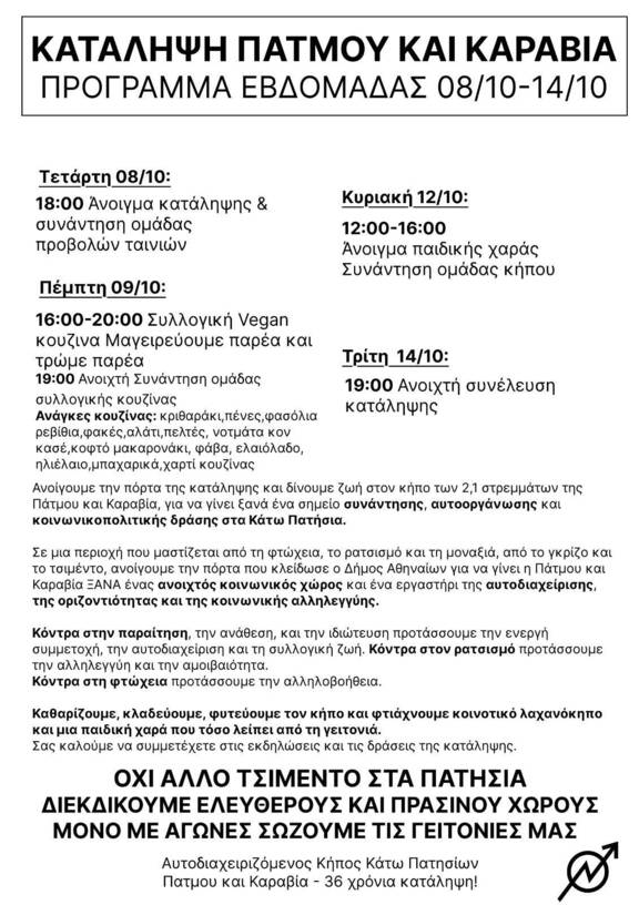 Κατάληψη Πάτμου & Καραβία Ευγενίου Καραβία 23, Κάτω Πατήσια (5' από ΗΣΑΠ Κάτω Πατήσια, Τρόλεϊ 3,5,11,14 & λεωφορεία Α8,608: στάση ΑΓΙΟΣ ΛΟΥΚΑΣ)