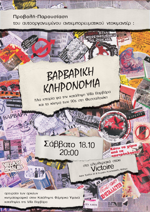 Το αυτοοργανωμένο - αντιεμπορευματικό ντοκιμαντέρ Βαρβαρική Κληρονομιά είναι η απόπειρα καταγραφής μιας ιστορίας για την κατάληψη Villa Βαρβάρα και το κίνημα της Θεσσαλονίκης στα 90s. Η δημιουργία του βασίστηκε πάνω σε 17 συνεντεύξεις συντρόφων και συντροφισσών που δραστηριοποιούνταν στο κίνημα εκείνη την περίοδο και στην έρευνα πάνω στο αντίστοιχο αρχειακό υλικό (βίντεο, φωτογραφίες, αφίσες, κείμενα, έντυπα). Στόχος του είναι να μοιραστεί εργαλεία έρευνας και καταγραφής της ιστορίας με το κίνημα και να παρακινήσει για αντίστοιχες απόπειρες στο μέλλον.