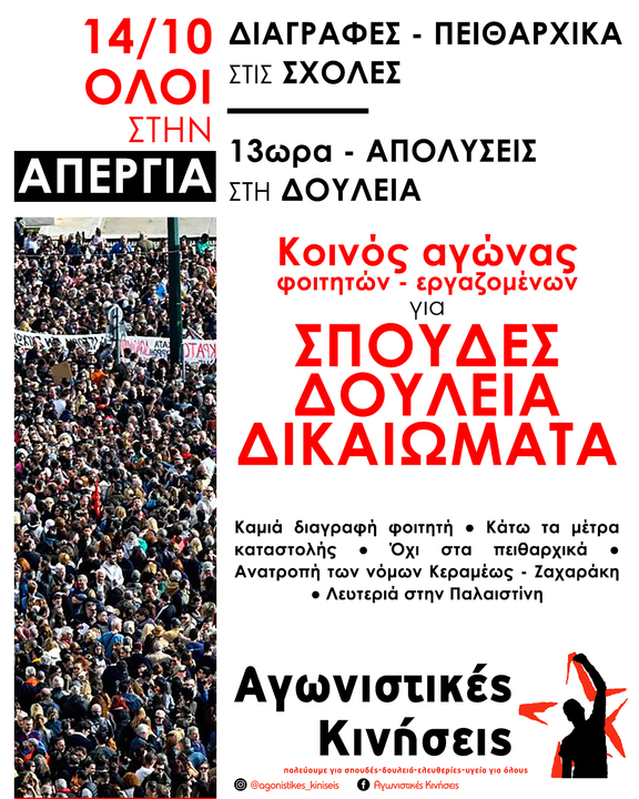 Αγωνιστικές Κινήσεις | 14/10, Όλοι στην απεργία! Κοινός αγώνας φοιτητών και εργαζομένων για σπουδές, δουλειά με δικαιώματα
