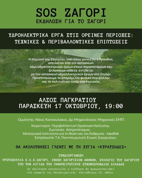 Η πρωτοβουλία SOS Ζαγόρι, με τη στήριξη της Πανηπειρωτικής Συνομοσπονδίας Ελλάδας, διοργανώνει εκδήλωση με θέμα: