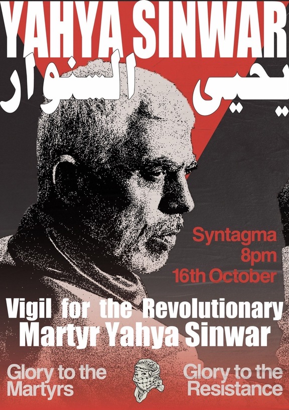 Join us in Syntagma this Thursday, October 16th at 20:00 for a vigil in honor of the revolutionary anti-colonial commander Yahya Sinwar (Abu Ibrahim) upon the first anniversary of his martyrdom by Zionist terrorists on the battlefield.
