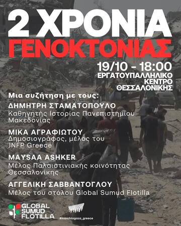 Σε αυτή την κρίσιμη στιγμή που η προσπάθεια αναδιάταξης του χάρτη της Μέσης Ανατολής συμπίπτει με το κλείσιμο ενός μεγάλου κύκλου για την πρωτοβουλία μας, αυτόν της ανθρωπιστικής αποστολής Global Sumud Flotilla, τα ερωτήματα πολλαπλασιάζονται ενώ η στήριξη του αγώνα των Παλαιστινίων για ελευθερία και αξιοπρέπεια παραμένει επιτακτική. Σε αυτά τα πλαίσια, διοργανώνουμε στις 19 Οκτωβρίου και ώρα 18:00 στο Εργατοϋπαλλιλικο Κέντρο Θεσσαλονίκης (Ε.Κ.Θ.) μια εκδήλωση-συζήτηση στη Θεσσαλονίκη, με τίτλο «Παλαιστίνη: 2 χρόνια γενοκτονίας & το διεθνές κίνημα αλληλεγγύης", με ομιλιτές/τριες: