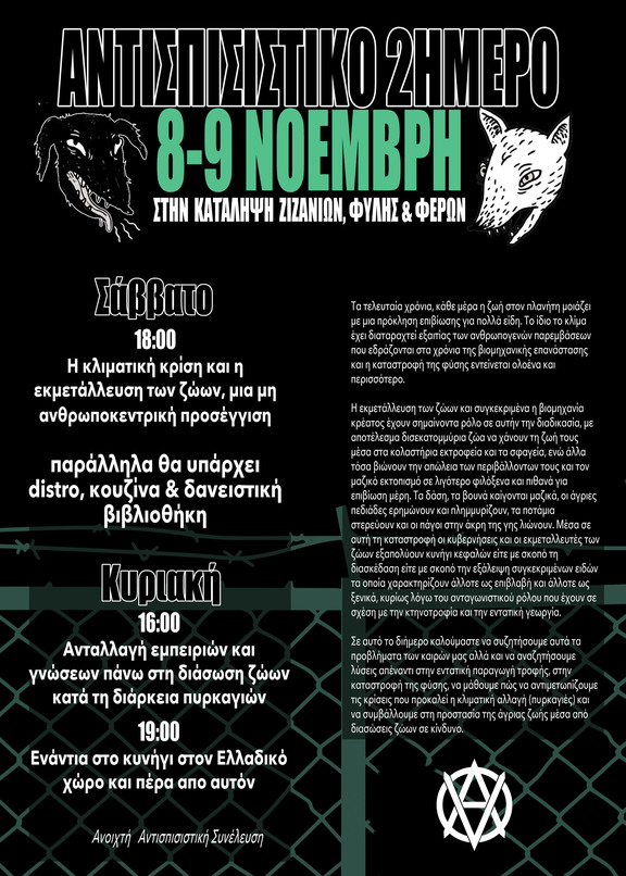 Τα τελευταία χρόνια, κάθε μέρα η ζωή στον πλανήτη μοιάζει με μια πρόκληση επιβίωσης για πολλά είδη. Το ίδιο το κλίμα έχει διαταραχτεί εξαιτίας των ανθρωπογενών παρεμβάσεων που εδράζονται στα χρόνια της βιομηχανικής επανάστασης και η καταστροφή της φύσης εντείνεται ολοένα και περισσότερο. Η εκμετάλλευση των ζώων και συγκεκριμένα η βιομηχανία κρέατος έχουν σημαίνοντα ρόλο σε αυτήν την διαδικασία, με αποτέλεσμα δισεκατομμύρια ζώα να χάνουν τη ζωή τους μέσα στα κολαστήρια εκτροφεία και τα σφαγεία, ενώ άλλα τόσα βιώνουν την απώλεια των περιβάλλοντών τους και τον μαζικό εκτοπισμό σε λιγότερο φιλόξενα και πιθανά για επιβίωση μέρη. Τα δάση, τα βουνά καίγονται μαζικά, οι άγριες πεδιάδες ερημώνουν και πλημμυρίζουν, τα ποτάμια στερεύουν και οι πάγοι στην άκρη της γης λιώνουν. Μέσα σε αυτή τη καταστροφή οι κυβερνήσεις και οι εκμεταλλευτές των ζώων εξαπολύουν κυνήγι κεφαλών είτε με σκοπό τη διασκέδαση είτε με σκοπό την εξάλειψη συγκεκριμένων ειδών τα οποία χαρακτηρίζουν άλλοτε ως επιβλαβή και άλλοτε ως ξενικά, κυρίως λόγω του ανταγωνιστικού ρόλου που έχουν σε σχέση με την κτηνοτροφία και την εντατική γεωργία. Σε αυτό το διήμερο καλούμαστε να συζητήσουμε αυτά τα προβλήματα των καιρών μας αλλά και να αναζητήσουμε λύσεις απέναντι στην εντατική παραγωγή τροφής, στην καταστροφή της φύσης, να μάθουμε πώς να αντιμετωπίζουμε τις κρίσεις που προκαλεί η κλιματική αλλαγή (πυρκαγιές) και να συμβάλλουμε στην προστασία της άγριας ζωής μέσα από διασώσεις ζώων σε κίνδυνο.