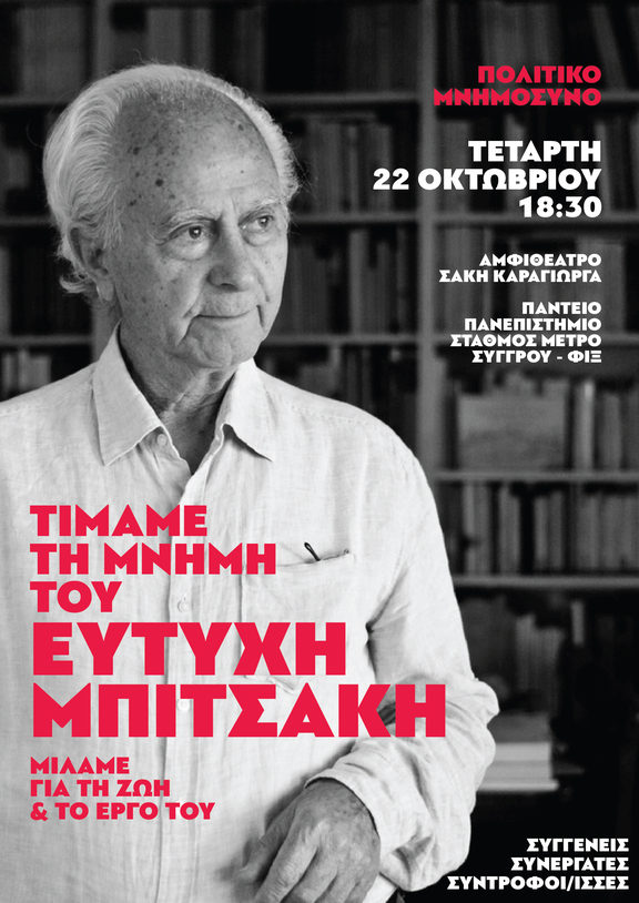 Σας καλούμε την Τετάρτη 22 Οκτωβρίου 2025 στις 6.30 μ.μ. στο πολιτικό μνημόσυνο για τον Ευτύχη Μπιτσάκη, στο Πάντειο Πανεπιστήμιο, αμφιθέατρο Σάκη Καράγιωργα ΙΙ, σταθμός Συγγρού-Φιξ του μετρό.