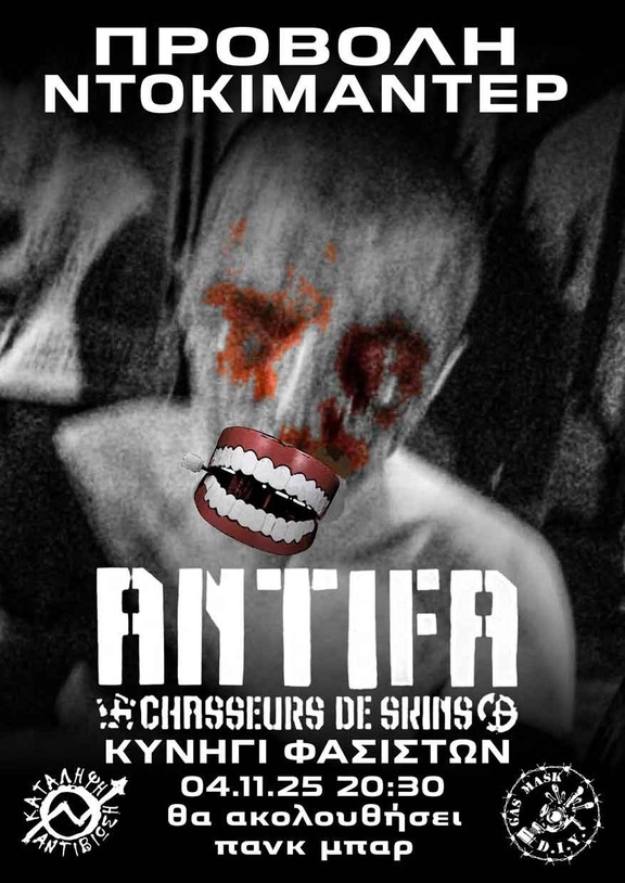 Προβολή ντοκιμαντέρ: Chasseurs De Skins (Κυνήγι Φασιστών) στις 04/11 20:30 στην κατάληψη Αντιβίωση. Θα ακολουθήσει punk bar για την οικονομική ενίσχυση της ομάδας.