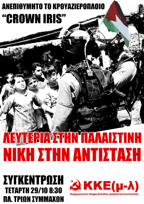Η Κ.Ο. Πάτρας του ΚΚΕ(μ-λ) καλεί στην συγκέντρωση αλληλεγγύης στην Παλαιστίνη και καταγγελίας του ελλιμενισμού του Crown Iris την Τετάρτη 29 Οκτώβρη στις 8:30 το πρωί στην πλατεία Τριών Συμμάχων.