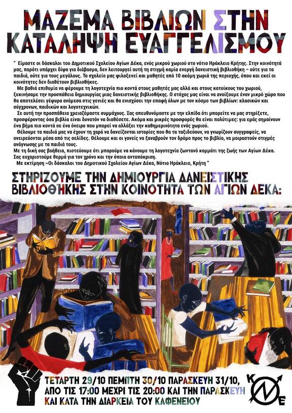 Στα πλαίσια του δημοσίου καλέσματος των δασκάλων του Δημοτικού Σχολείου των Αγίων Δέκα για την συλλογή βιβλίων με σκοπό την δημιουργία δανειστικής βιβλιοθήκης, αποφασίσαμε να στηρίξουμε την συγκεκριμένη κίνηση με το άνοιγμα της Κατάληψης τις απογευματινές ώρες στις 29-31/10 για το μάζεμα (όσο περισσότερων) βιβλίων και την επίτευξη του στόχου των δασκάλων.