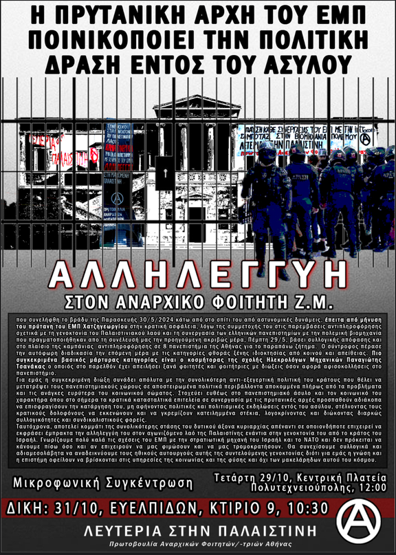 ΑΛΛΗΛΕΓΓΥΗ ΣΤΟΝ ΑΝΑΡΧΙΚΟ ΦΟΙΤΗΤΗ Ζ.Μ. που συνελήφθη το βράδυ της Παρασκευής 30/5/24 κάτω από το σπίτι του από αστυνομικές δυνάμεις, έπειτα από μήνυση του πρύτανη του ΕΜΠ Χατζηγεωργίου στην κρατική ασφάλεια, λόγω της συμμετοχής του στις παρεμβάσεις αντιπληροφόρησης σχετικά με τη γενοκτονία του παλαιστινιακού λαού και τη συνεργασία των ελληνικών πανεπιστημίων με την πολεμική βιομηχανία, που πραγματοποιήθηκαν από τη συνέλευση μας την προηγούμενη ακριβώς μέρα, Πέμπτη 29/5, βάσει συλλογικής απόφασης και στο πλαίσιο της καμπάνιας αντιπληροφόρησης σε 8 πανεπιστήμια της Αθήνας για το παραπάνω ζήτημα. Πιο συγκεκριμένα βασικός μάρτυρας κατηγορίας είναι ο κοσμήτορας της σχολής Ηλεκρολόγων Μηχανικών Παναγιώτης Τσανάκας ο οποιός στο παρελθόν έχει απειλήσει ξανά φοιτητές και φοιτήτριες με διώξεις όσον αφορά αφισοκολλήσεις στο πανεπιστήμιο.
