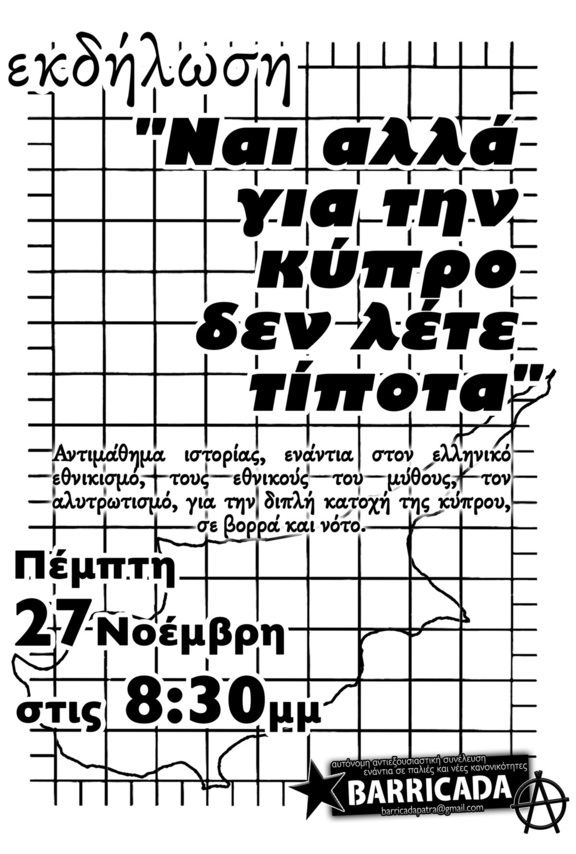 …στον αυτοδιαχειριζόμενο χώρο ΑΝΑΤόΠΙΑ. Αντιμάθημα ιστορίας ενάντια στον ελληνικό εθνικισμό, τους εθνικούς του μύθους, τον αλυτρωτισμό, για τη διπλή κατοχή της κύπρου, σε βορρά και νότο. Από την αυτόνομη αντιεξουσιαστική συνέλευση ενάντια σε παλιές και νέες κανονικότητες BARRICADA.
