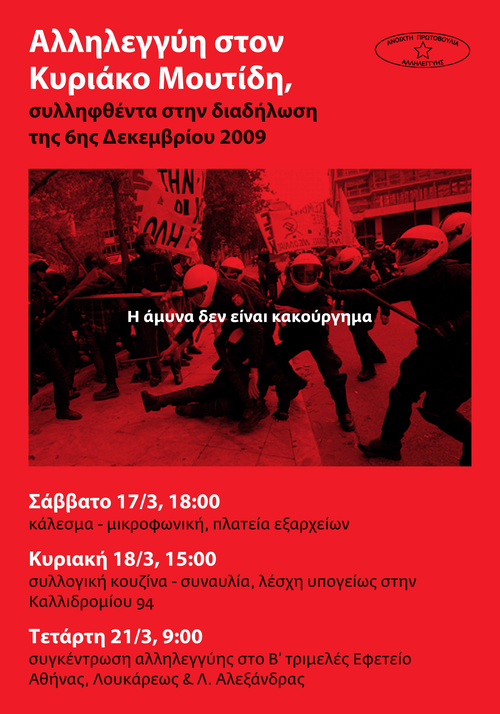 Την Τετάρτη 21 Μαρτίου 2012, στο Β' Τριμελές εφετείο Αθήνας δικάζεται ο σύντροφος Κυριάκος Μουτίδης με κατηγορίες σε βαθμό κακουργήματος. Είναι ένας από τους συλληφθέντες της διαδήλωσης μνήμης και αντίστασης της 6ης Δεκέμβρη 2009,ένα χρόνο μετά τη δολοφονία του 15ου χρονου Αλεξ. Γρηγορόπουλου από την Ελ. Ας.