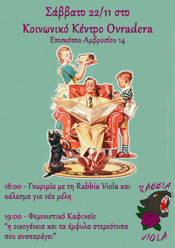 Στις 19:00 θα ακολουθήσει φεμινιστικό καφενείο με θέμα "Η οικογένεια και τα έμφυλα στερεότυπα που αναπαράγει".