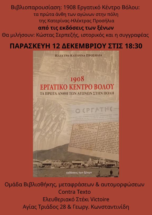 Στις 18:30: Βιβλιοπαρουσίαση - 1908 Εργατικό Κέντρο Βόλου, τα πρώτα άνθη των αγώνων στην πόλη