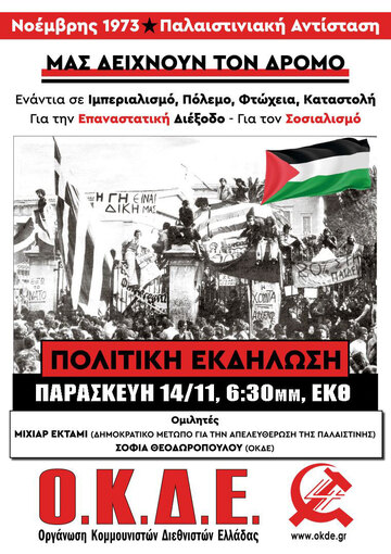 Μπροστά στον κίνδυνο ενός Τρίτου Παγκόσμιου Πολέμου που ανοίγεται μπροστά μας, αλλά και μπροστά στη γενοκτονία του Παλαιστινιακού λαού από το κράτος-δολοφόνο του Ισραήλ, πρέπει να αντιταχθούμε στα πολεμικά σχέδια των ΗΠΑ-Ισραήλ, αλλά και στα φιλοπολεμικά σχέδια της κυβέρνησής μας, που μας εμπλέκει ολοένα και περισσότερο σε αυτές τις συγκρούσεις. Όπως κάναμε στο Πολυτεχνείο του '73, που ένα από τα βασικά συνθήματά του ήταν «ΕΞΩ ΗΠΑ-ΝΑΤΟ», αναδεικνύοντας έτσι τον αντιπολεμικό χαρακτήρα του κινήματος!