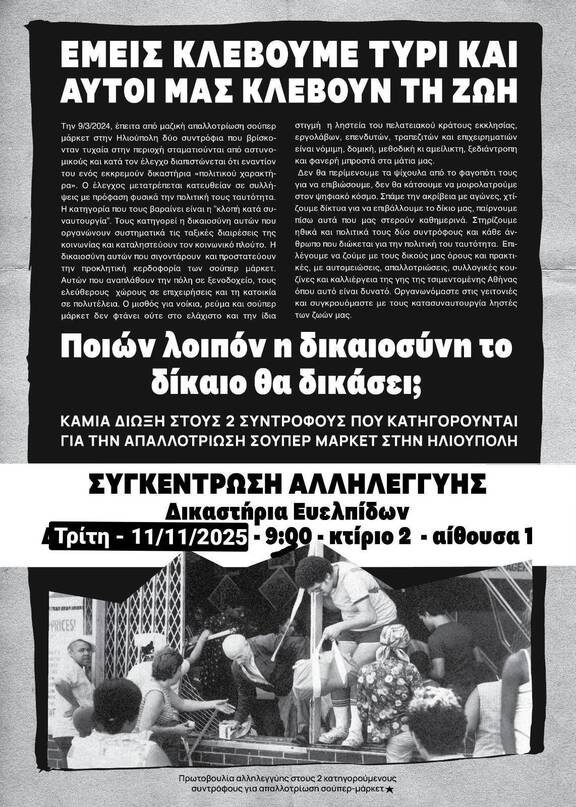 Την 9/3/2024, έπειτα από μαζική απαλλοτρίωση σούπερ μάρκετ στην Ηλιούπολη δύο συντρόφια που βρίσκονταν τυχαία στην περιοχή σταματιούνται από αστυνομικούς και κατά τον έλεγχο διαπιστώνεται ότι εναντίον του ενός εκκρεμούν δικαστήρια "πολιτικού χαρακτήρα". Ο έλεγχος μετατρέπεται κατευθείαν σε συλλήψεις με πρόφαση φυσικά την πολιτική τους ταυτότητα. Η κατηγορία που τους βαραίνει η είναι η "κλοπή κατά συναυτουργία". Τους κατηγορεί η δικαιοσύνη αυτών που οργανώνουν συστηματικά τις ταξικές διαιρέσεις της κοινωνίας και καταληδτευοθν τον κοινωνικό πλούτο. Η δικαιοσύνη αυτών που σιγοντάουν και προστατεύουν την προκλητική κερδοφορία των σούπερ μάρκετμ αυτών που αναπλάθουν την πόλη σε ξενοδοχείου τους ελεύθερους χώρους σε επιχειρήσεις και τα τη κατοικία σε πολυτέλεια. Ο μισθός για νοίκι, ρεύμα και σούπερ μάρκετ δεν φτάνει ούτε στο ελάχιστο και την ίδια στιγμή η ληστεία του πελατειακού κράτους εκκλησίας, εργολάβων, επενδυτών, τραπεζιτών και επιχειρηματιών είναι νόμιμη, δομική, μεθοδική κι αμείλικτη, ξεδιάντροπη και φανερή μπροστά στα μάτια μας.