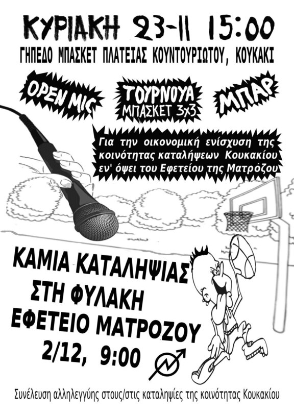 Θα παίξουμε ένα τουρνουά μπάσκετ 3χ3, θα έχουμε μπαρ και Open Mics. Όλα τα χρήματα που θα συγκεντρωθούν θα διατεθούν για την κάλυψη των εξόδων των συντροφιών μας που βρίσκονται αντιμέτωπα με το δικαστικό σύστημα.