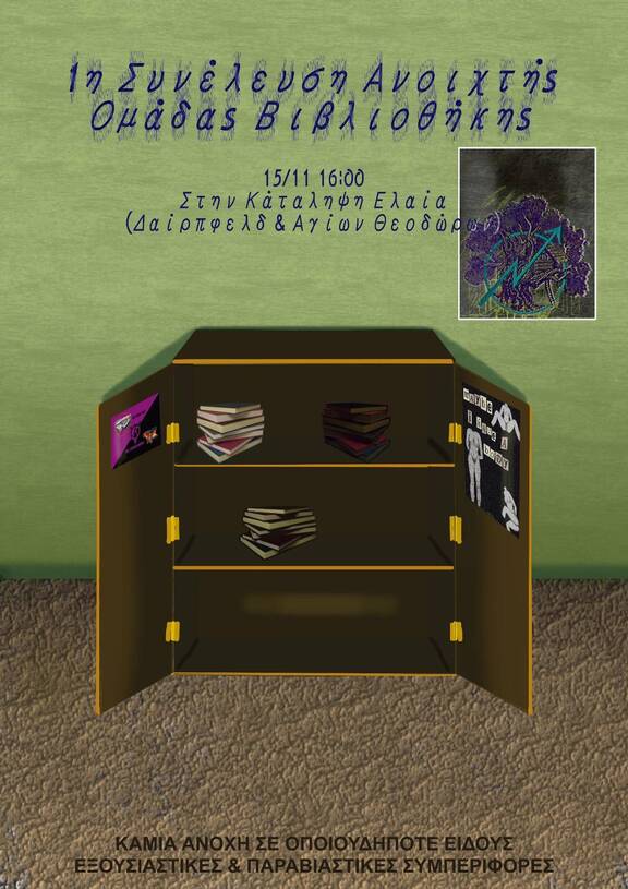 Το Σάββατο που μας έρχεται στις 16:00 καλούμε στη 1η συνέλευση της ανοιχτής ομάδας βιβλιοθήκης, ενός εγχειρήματος που επιθυμούμε να συλλογικοποιήσει το όποιο εσωτερικό βίωμα της επαφής με τα βιβλία, zines, περιοδικά και με το αρχείο της κατάληψης.
