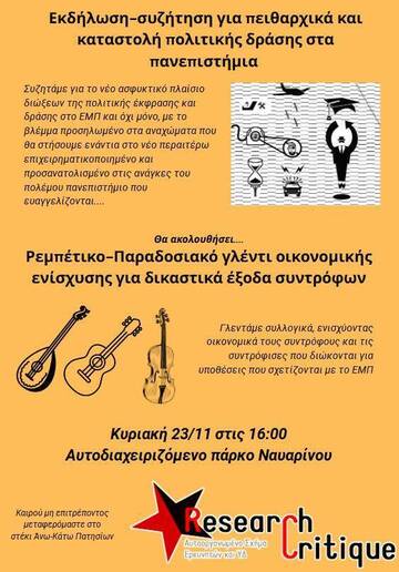 Ρεμπέτικο γλέντι δικαστικών εξόδων του Research Critique. Θα προηγηθεί ανοιχτή συζήτηση για τα πειθαρχικά και την καταστολή μέσα στις σχολές