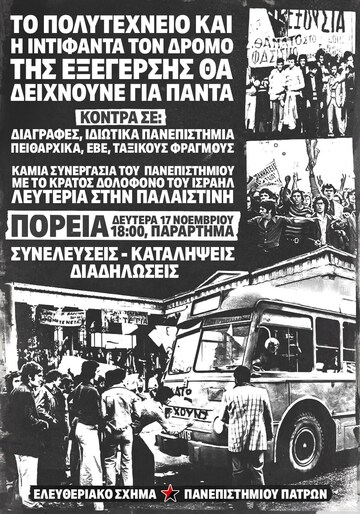 Η εξέγερση του Πολυτεχνείου αποτέλεσε την κορύφωση του αντιιμπεριαλιστικού, μεταξύ άλλων, αγώνα της «επταετίας». Αν και ξεκίνησε γύρω από τη διεκδίκηση ελευθεριών από τους φοιτητές, σύντομα γειώθηκε κοινωνικά, αποκτώντας συνολικό ταξικό, αντιιμπεριαλιστικό και αντιδικτατορικό χαρακτήρα. Εμείς λοιπόν από την πλευρά μας, ως φοιτητές και φοιτήτριες μπροστά στη διεθνή συγκυρία που σημαδεύεται από την γενοκτονία που εδώ και δεκαετίες το κράτος-δολοφόνο του Ισραήλ διαπράττει σε βάρος του παλαιστινιακού λαού με την πλήρη στήριξη του συμμαχικού ιμπεριαλιστικού μπλοκ ΗΠΑ- ΝΑΤΟ- ΕΕ, πρέπει να προτάξουμε την διεθνιστική αλληλεγγύη και να σταθούμε αδιαπραγμάτευτα στο πλευρό του μαχόμενου Παλαιστινιακού λαού που αντιστέκεται και αντεπιτίθεται με όλα τα μέσα και με ηρωική ψυχή. Είναι αναγκαίο να αναγνωρίσουμε πως το ελληνικό κράτος, μέλος του ΝΑΤΟ και της ΕΕ, είναι συνένοχο στην γενοκτονία που εξελίσσεται, και πως τα πανεπιστήμια χρησιμοποιούνται και εκείνα και εμπλέκονται άμεσα στην εμβάθυνση της συνεργασίας με το κράτος- δολοφόνο του Ισραήλ και στην υλική στήριξη του. Χαρακτηριστικό παράδειγμα αποτελεί η συνεργασία του ΕΜΠ με εταιρείες όπως η Intracom Defense, που εξειδικεύεται στην ανάπτυξη πολεμικού εξοπλισμού, ανήκει στον κρατικό ισραηλινό κολοσσό Israel Aerospace Industries και προμηθεύει απευθείας τον ισραηλινό στρατό. Ακόμη, έρευνες πραγματοποιούνται σε διάφορα πανεπιστημιακά ιδρύματα προς όφελος της εταιρείας κολοσσού Motor Oil, μιας εταιρείας που έχει ενεργό συμμετοχή στην σφαγή και συμφωνία χορηγίας υποτροφιών μεταξύ της Lockheed Martin, της μεγαλύτερης βιομηχανίας όπλων σε όλων τον πλανήτη με το ΕΚΠΑ . Η σύνδεση αυτή δεν εκλείπει από το Πανεπιστήμιο Πατρών, το οποίο συμμετέχει σε ερευνητικά προγράμματα (HERA, HERWINGT, CONVERGING και ACTUS) στα οποία έχει ενεργό ρόλο η Israel Aerospace Industries ltd. (IAI), κρατική εταιρία αεροδιαστημικής και άμυνας του Ισραήλ η οποία εμπλέκεται ενεργά. Οι τελευταίες εξελίξεις περιλαμβάνουν τις δολοφονίες Παλαιστινίων και βομβαρδισμούς από τις κατοχικές δυνάμεις, ενώ τα ισραηλινά στρατεύματα παραμένουν στην Λωρίδα, παρά την εκεχειρία που άρχισε να ισχύει από τις 10 Οκτώβρη. Ο παλαιστινιακός λαός δεν θα πάψει να αγωνίζεται για την ζωή και την ελευθερία του με τα δικά του μέσα και με την ένοπλη Αντίσταση του θα συνεχίσει να αποτελεί απροσπέλαστο εμπόδιο στους ιμπεριαλιστικούς σχεδιασμούς, ενώ δεν θα αφήσει στα αιματοβαμμένα χέρια των δυτικών ιμπεριαλιστικών δυνάμεων την υπόθεση της απελευθέρωσης του. Έτσι δείχνει τον δρόμο στους υπόλοιπους λαούς του κόσμου και μας καλεί να σταθούμε στο ύψος των περιστάσεων και από το δικό μας μετερίζι να καταβάλλουμε κάθε δυνατή προσπάθεια για το τέλος της γενοκτονίας.