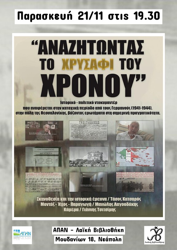 Την Παρασκευή 21 Νοέμβρη στις 19.30 στο στέκι ΑΠΑΝ - ΛΑΪΚΗ ΒΙΒΛΙΟΘΗΚΗ, θα προβληθεί το ιστορικό ντοκιμαντέρ του Τάσου Κατσαρού "Αναζητώντας το Χρυσάφι του Χρόνου". Το ντοκιμαντέρ πραγματεύεται την περίοδο της γερμανικής κατοχής στη Θεσσαλονίκη και την Αντίσταση.