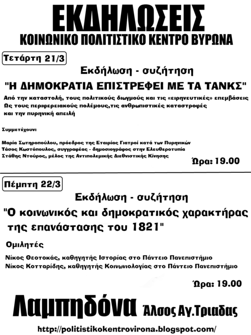 - Την Πέμπτη 22 Μαρτίου στις 7 μμ στη Λαμπηδόνα θα πραγματοποιηθεί συζήτηση με θέμα: "Ο κοινωνικός και δημοκρατικός χαρακτήρας της επανάστασης του 1821". Ομιλητές οι: Νίκος Θεοτοκάς (καθηγητής Ιστορίας στο Πάντειο Πανεπιστήμιο) και Νίκος Κοτταρίδης (καθηγητής Κοινωνιολογίας στο Πάντειο Πανεπιστήμιο.